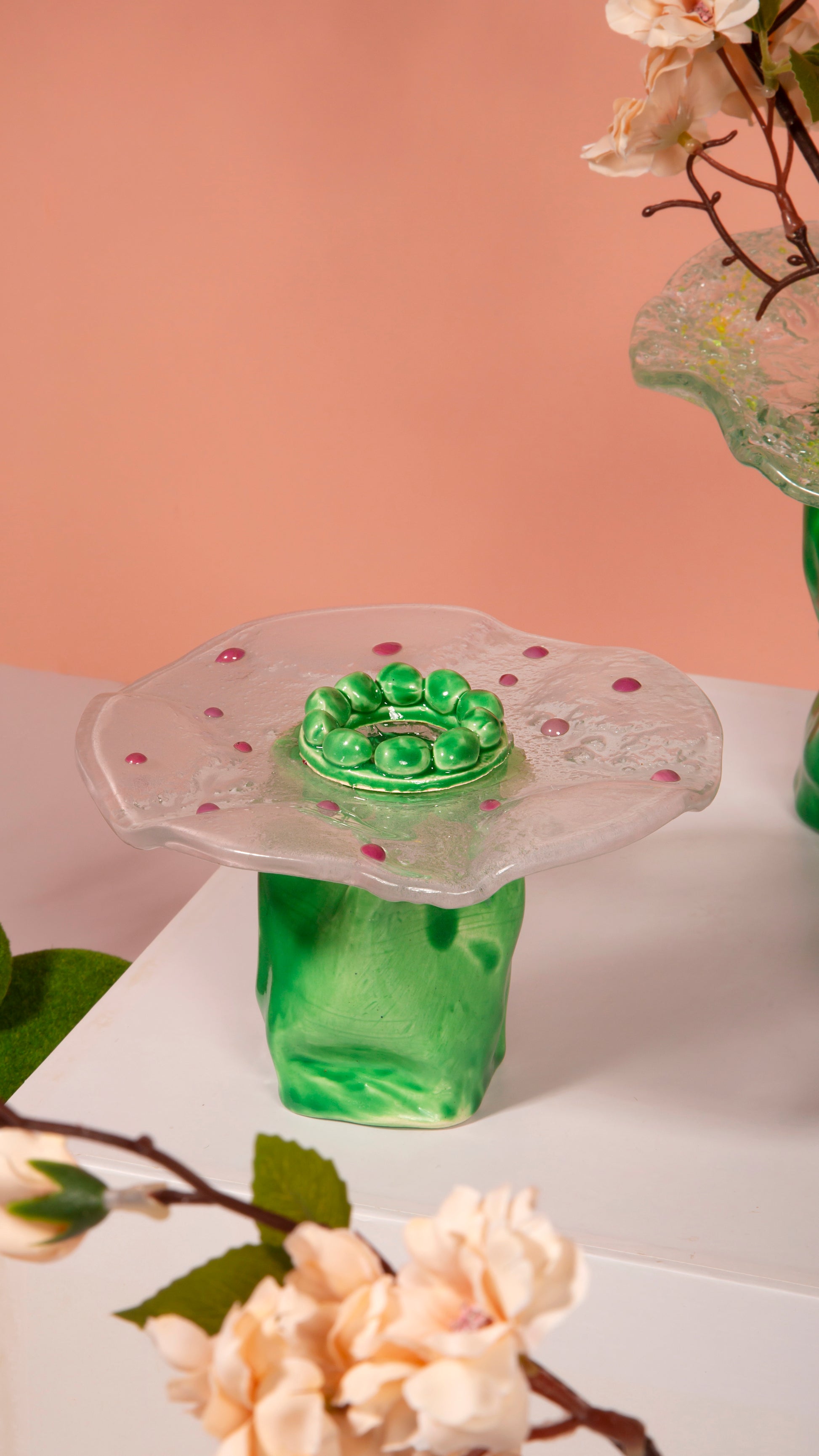 With or without flowers, this charming vase combines the earthy elegance of ceramic with the luminous beauty of glass. Its vibrant colors and organic shape make it a stand out piece.